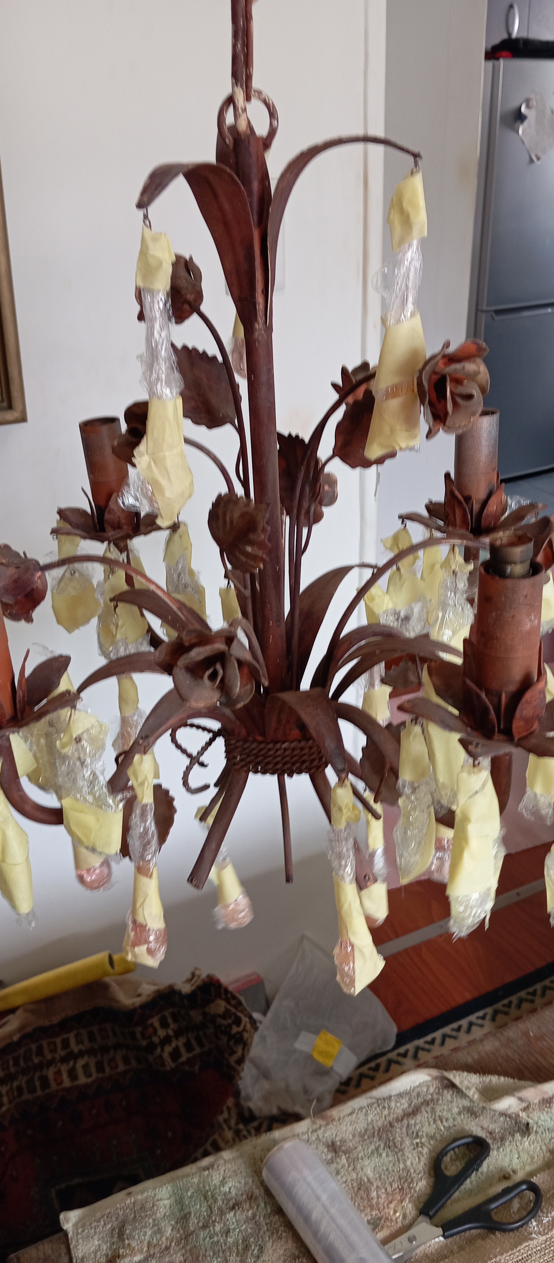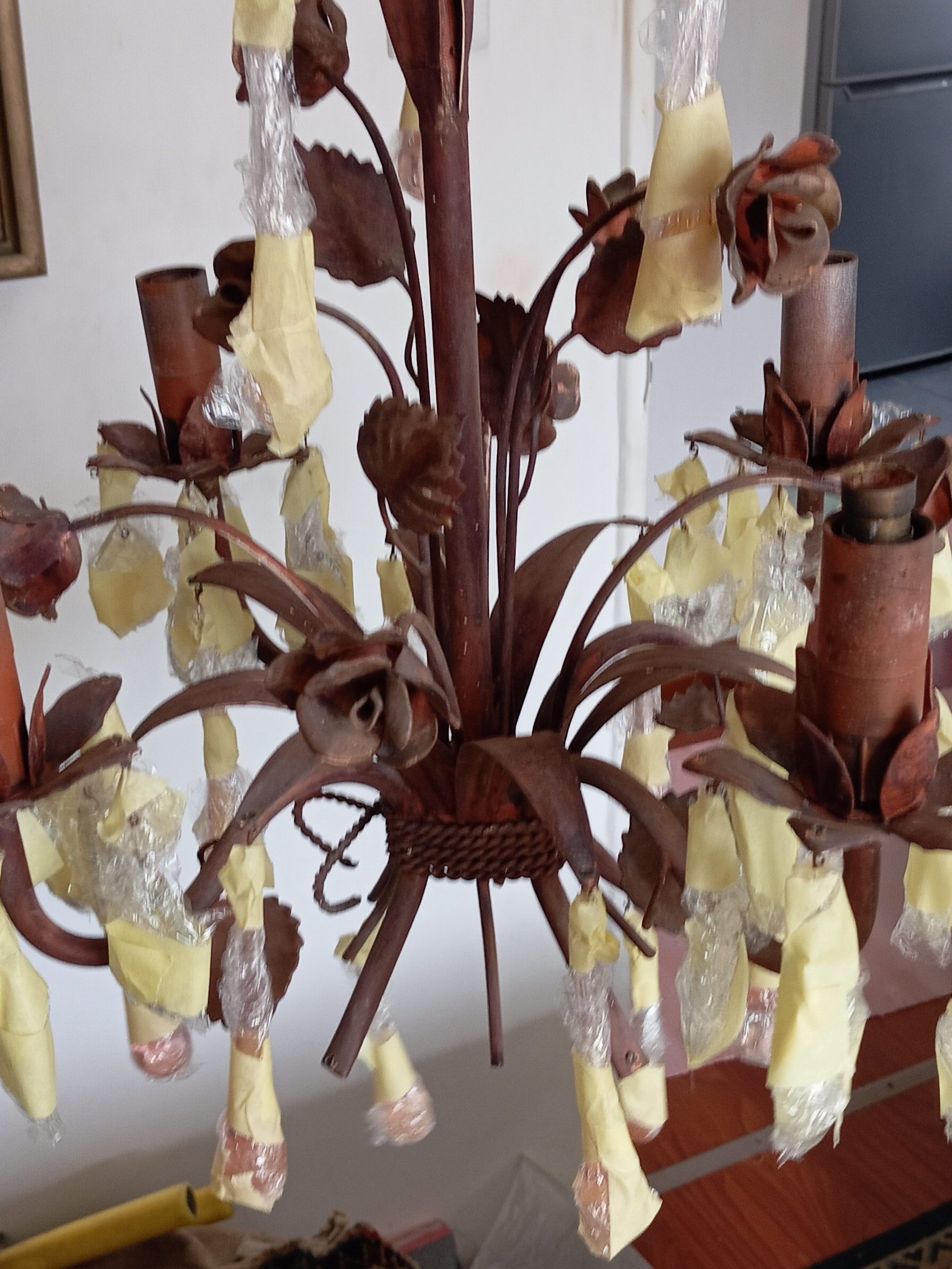 I have just started a new job for a client, a metal chandelier that needs a makeover. I don’t often do paint effects, but for this lovely lady I said yes. Each crystal must be wrapped in plastic (no I can’t take them off, which would be easier π ) and I sand the metal lightly with water paper. Phase 1 accomplished!